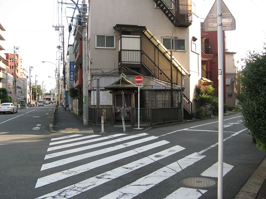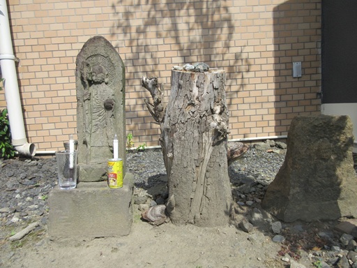 | (9)延命地蔵尊 1777年(安永6年)念仏を行った用賀村の女性達が建立しました。 ここで地形を利用した旧道の慈眼寺通(左)と人手で切通しを行ってショートカットした新道の行善寺通(右)に分かれます。 延命地蔵尊の右側を進みます。 |
