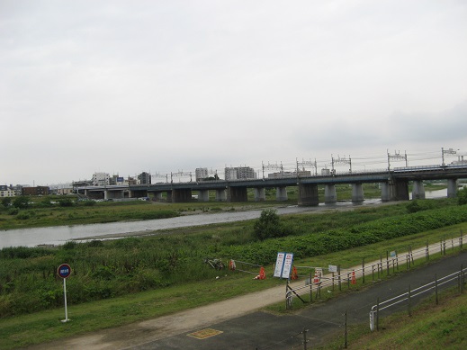 | 堤防から川崎市方面を望みます。 二子の渡しは廃止されてしまったので、右側に見える田園都市線横の二子橋で多摩川を渡ります。 |