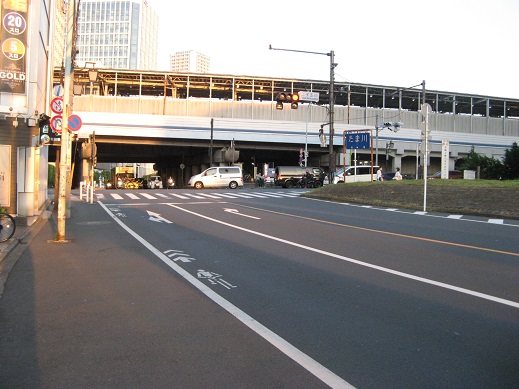 | 国道246号を横断して、正面の田園都市線二子玉川駅ホームをくぐります。 | |