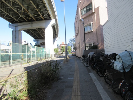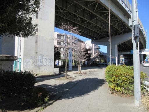 | 上を瀬田交差点の先で別れた国道246号の新道である新二子橋に接続する玉川高架橋が通っています。 高架橋を抜けてから左折します。 |