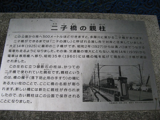 1925(大正14年)から1976年(昭和51年)まで使われた初代二子橋の親柱(欄干の端にある太い柱)です。