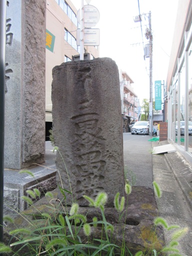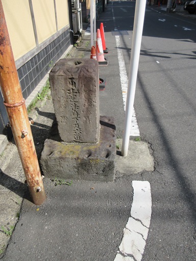庚申堂にある1847年(弘化4年)造立の青面金剛像庚申塔と道標(側面) 右:北 青山道 左:南 大山道 裏:東 六郷道 |
