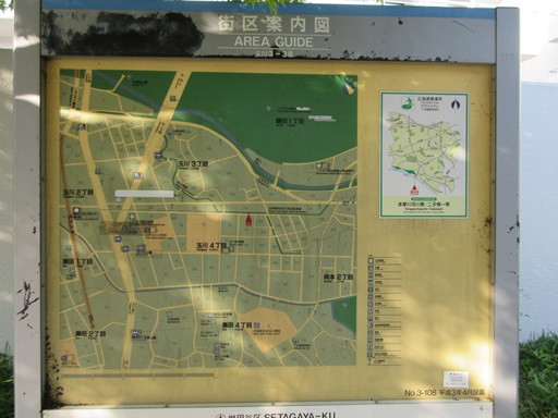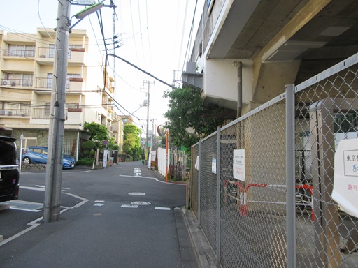 | 旧・玉川線は現・田園都市線とほぼ同じところを登っていましたが、砧線はここで左へカーブしてフラットでした。 廃線跡は通れないので、道なりに右折します。 |