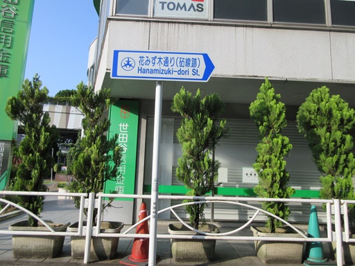 | 世田谷信用金庫の脇に「花みずき通り(砧線跡)」の標識があります。 | |