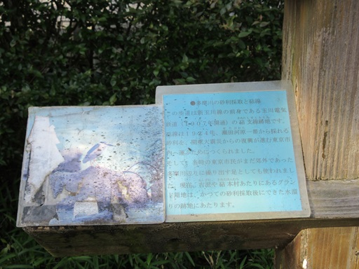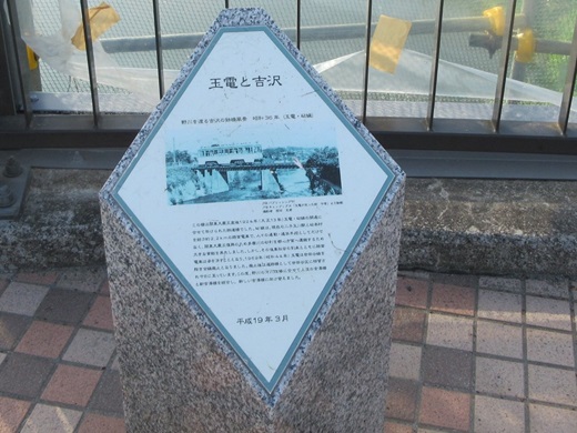 | 吉澤橋中ほどに「玉電と吉沢」の説明と野川を渡る玉電の写真があります。 | |